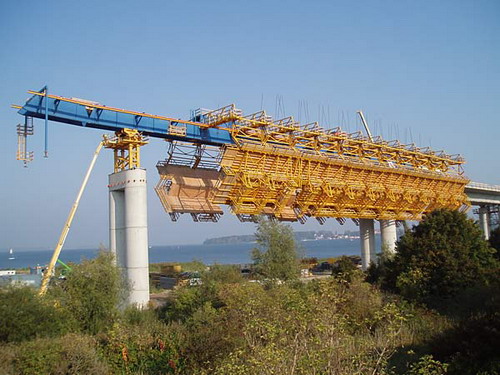 架橋機**是將預制好的梁片放置到預制好的橋墩上去的設備。架橋機屬于起重機范疇,因為其主要功能是將梁片提起,然后運送到位置后放下。但其與一般意義上的起重機有很大的不同。其要求的條件苛刻,并且存在梁片上走行,或者叫縱移。架橋機是一種運行工作范圍廣、性能優良、操作方便、結構安全的鋼結構軌道式預制梁吊裝架設設備。