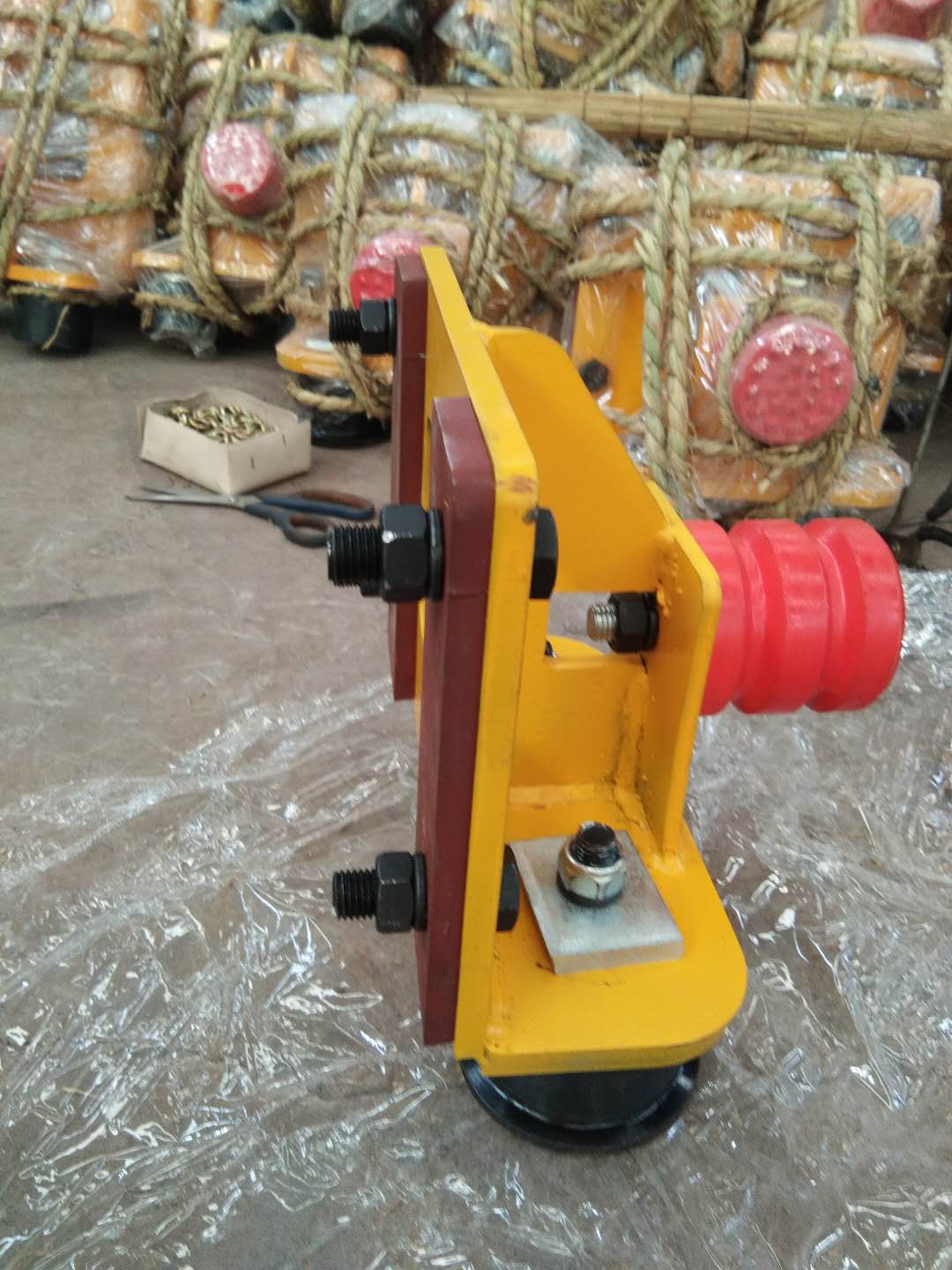 本裝置適用于單梁,雙梁起重機(jī)大車運(yùn)行機(jī)構(gòu)及雙梁小車運(yùn)行機(jī)構(gòu),適用車輪分別為L(zhǎng)D輪結(jié)構(gòu)和角形軸承箱車輪結(jié)構(gòu)。本裝置加裝在運(yùn)行端梁前端,依靠運(yùn)行軌道兩側(cè)的水平輪,限制起重機(jī)大車輪沿啃軌傾向,在大車車輪摩擦軌道之前,先行以滾動(dòng)方式與軌道接觸,來(lái)抵消大車運(yùn)行部分水平側(cè)向力,防止啃軌;同時(shí)兩只水平輪安裝位置低于軌道平面及車輪輪沿,這也相當(dāng)于**限度地加高了車輪輪沿的高度。防止因?yàn)樵囕嗇喲靥珳\而造成的起重機(jī)脫軌事故。